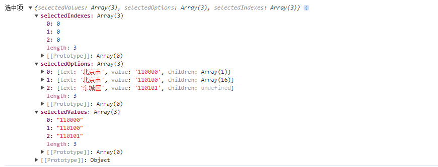 confirm事件参数中:selectedValues存储选中的省市区, 三级城市地区编码的有序数组.selectedOptions为省市区的对象数组.