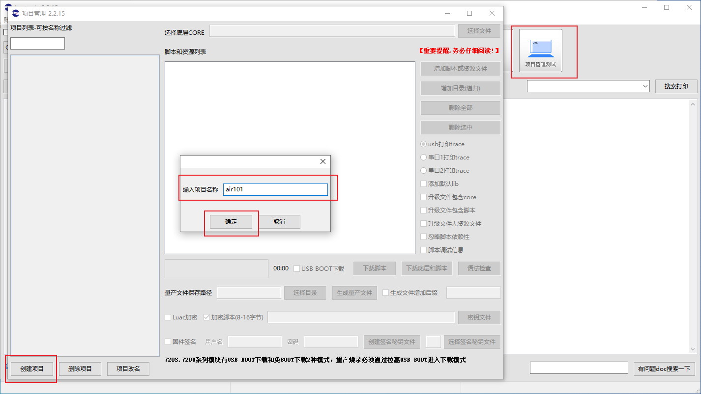 - 点击项目管理测试, 创建项目, 然后选择底层 CORE (即固件), 然后增加脚本 (即编写的 lua 脚本)
