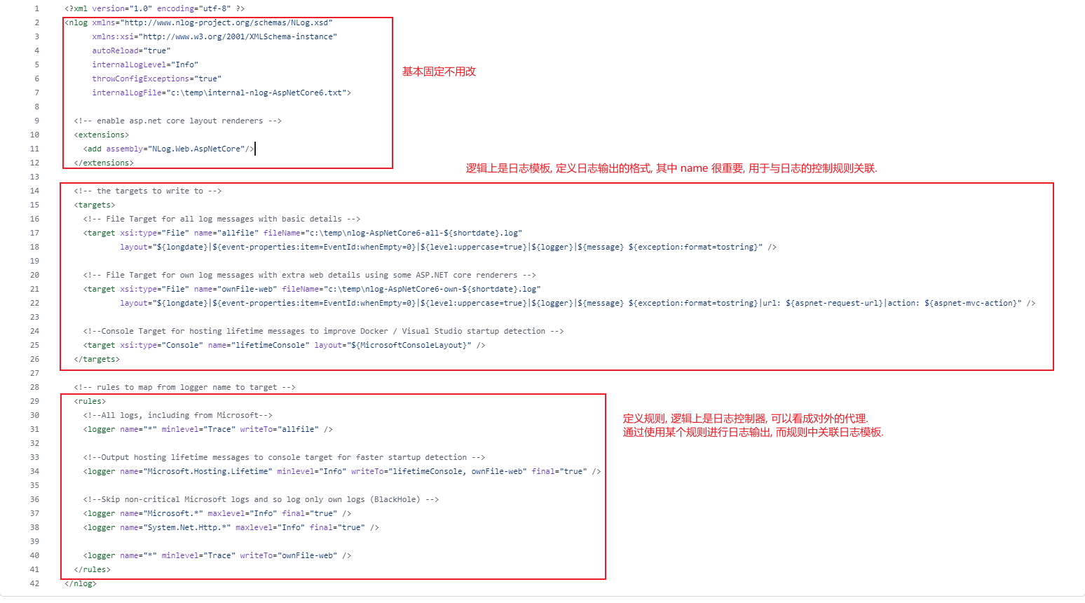 在根目录下创建文件 nlog.config, 它是一个 XML 文件: