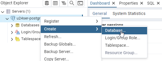 右击, 左侧树中的 Database Cluster, 在弹出上下文菜单中选择 Create Database 选项.