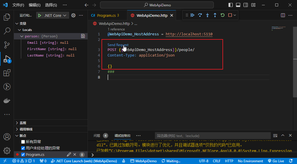 然后使用 VSCode 打开, 修改 Program.cs 中的代码: